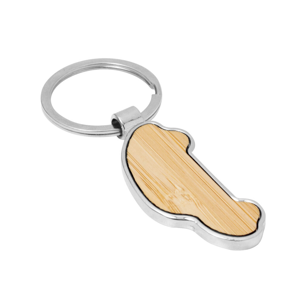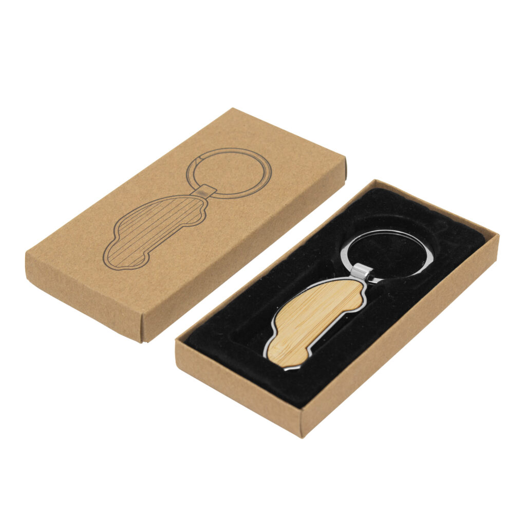 Llavero con forma de auto. Estructura metálica con aleación de zinc con acabado brillante y panel frontal de bambú barnizado.