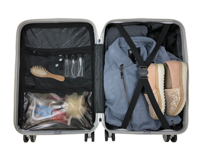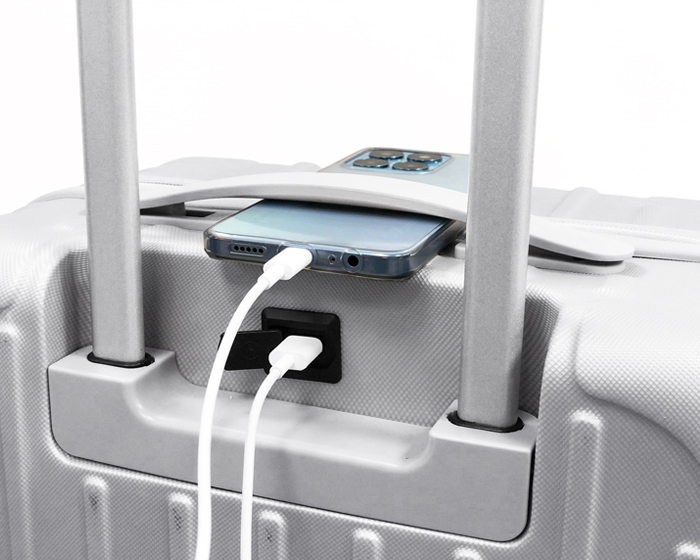 Maleta de viaje texturizada con ruedas dobles que hacen juego con el color de la maleta. Cuenta con candado de seguridad TSA con contraseña, asa metálica expandible de 2 niveles con mango de plástico, asa superior y doble cierre. Interior de doble compartimento 1 para guardar prendas húmedas y otro para accesorios con cierre y elástico de seguridad para sujetar, en el exterior de la maleta incluye puerto de carga USB para conectar tus dispositivos móviles, un porta vasos plegable en la parte trasera de la maleta. Incluye placa metálica por separado para grabar. Tamaño ideal para transportar en aerolíneas económicas.