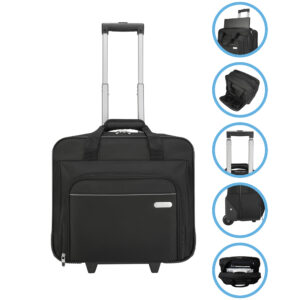 Maletín con ruedas y 3 compartimentos: 1 compartimento principal con porta lap top, un compartimento trasero y uno frontal con cierres y bolsas internas. Incluye asas en la parte superior y asa retráctil metálica.