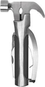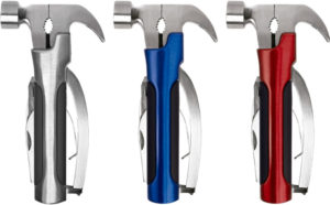 Martillo multifunción que contiene: cuchillo, sierra, abrelatas, destapador, desarmador plano, desarmador de cruz y martillo pinza con saca clavos. Funda con cierre de velcro.