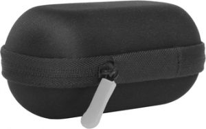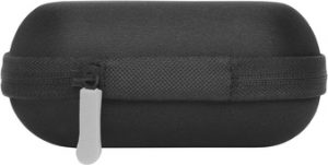 En la base: goma antideslizante, interruptor de encendido y apagado, botón de reproducción/pausa, respuesta y finalización de llamada. Luz led que indica carga. Micrófono que permite responder llamadas. Entrada para audífonos y puerto USB para su carga. Estuche con cierre, en su interior un pequeño bolsillo de red. Incluye cable de carga USB y de audio.