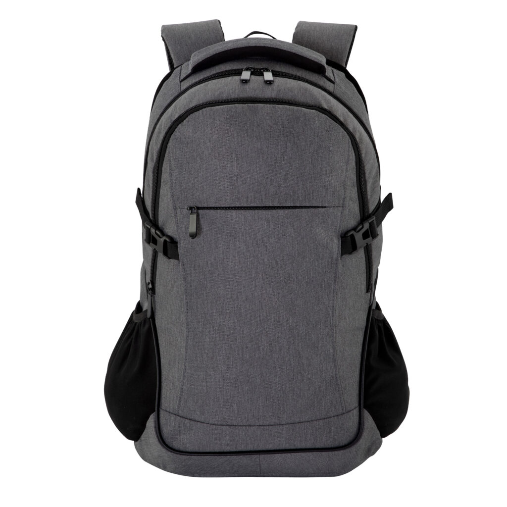 Mochila urbana porta notebook de hasta 16 pulgadas. Compartimento principal con cierre, interior con 2 bolsillos, bolsillo porta notebook acolchado y elástico de seguridad y bolsillo porta tablet de hasta 11 pulgadas. Compartimento frontal con cierre, exterior con cierre horizontal, interior con bolsillos organizadores. 2 bolsillos laterales de tela elastizada color negro. 2 correas de hebillas ajustables al volumen que se traslade. Asa acolchada y reforzada. Espalda acolchada con red que permite ventilación. Tiradores de cierre metálicos.