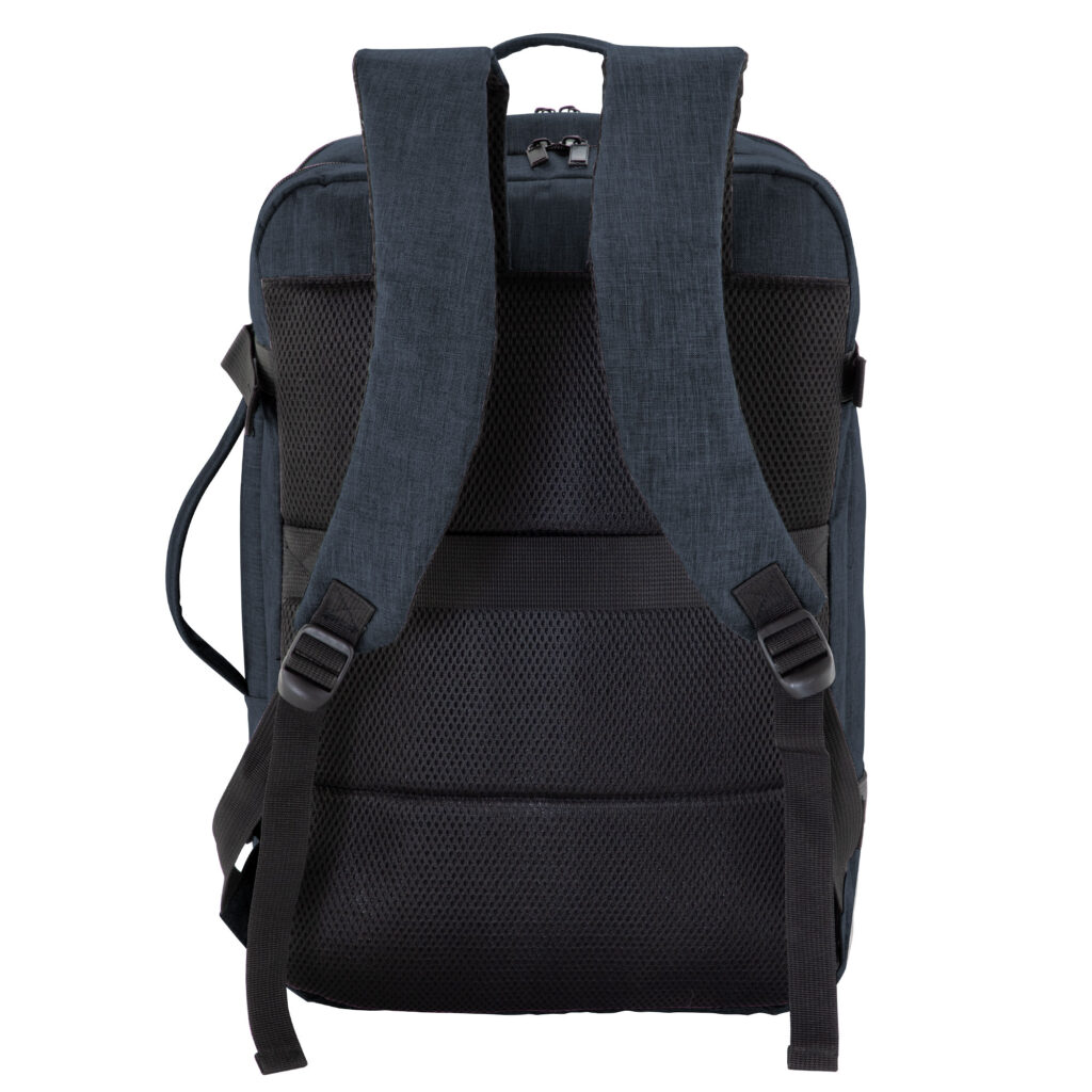 Mochila carry on con 4 compartimentos acolchados. Compartimento principal central con cierre de apertura 360° y elástico con hebilla para contener la ropa en un viaje de trabajo. Compartimento posterior con cierre y porta notebook de hasta 17 pulgadas. Compartimento frontal, exterior con cierre horizontal e interior con bolsillos organizadores. Dos asas, vertical y horizontal para un mejor traslado.  4 correas de hebillas ajustables al volumen que se traslade. Espalda acolchada con red que permite ventilación. Tira para sujetar la mochila en la manija extensible de un equipaje de mano. Correas acolchadas. Tiradores de cierre plásticos.