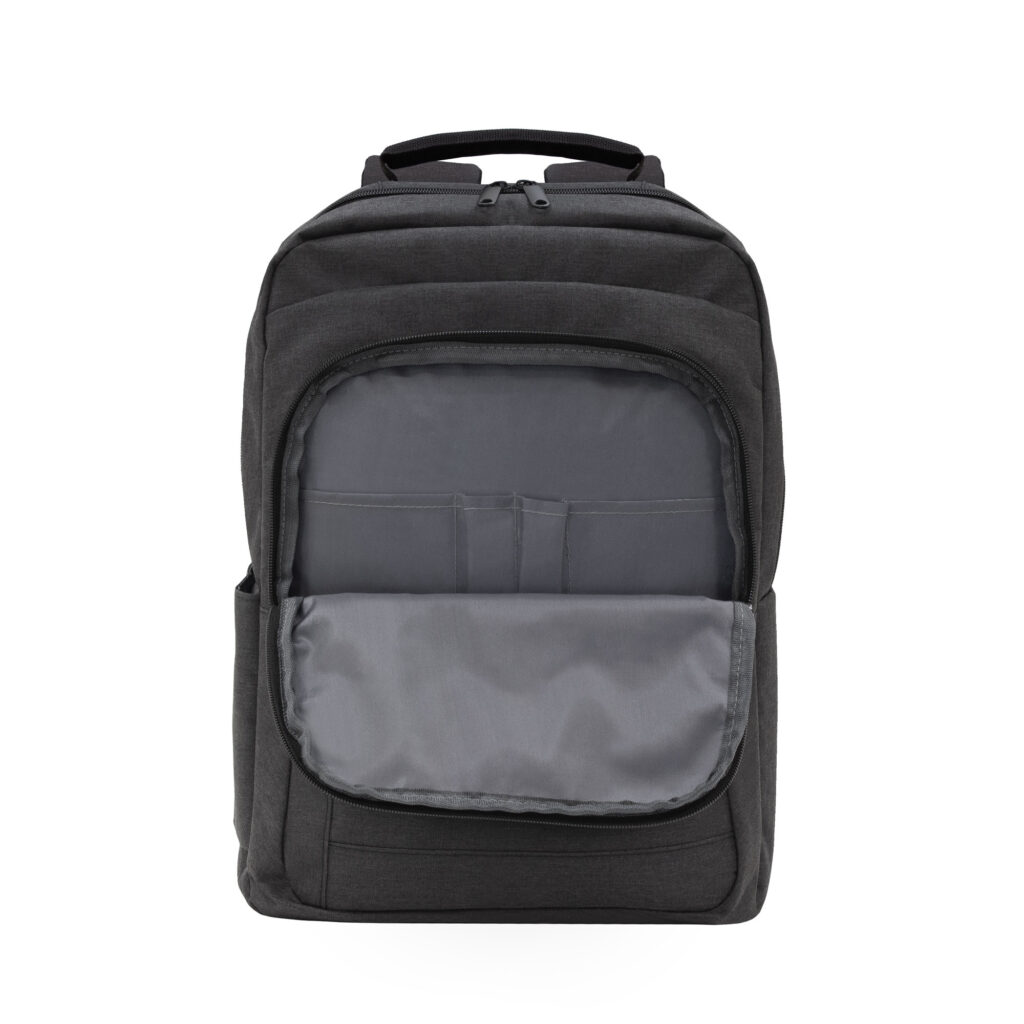 29 x 41 x 11 cm. Capacidad 13 litros. Poliéster wulong 300D. Interior forrado en 210D. Mochila porta notebook de hasta 15 pulgadas. Cuenta con dos compartimentos: el compartimento principal con bolsillo acolchado para la notebook, y otro compartimento frontal con bolsillo organizador. Frente con bolsillo horizontal con cierre. Asa superior, correas y respaldo acolchados. Correas ajustables. Tira para sujetar la mochila en la manija extensible de un equipaje de mano. Tiradores de cierres metálicos color negro.
