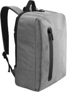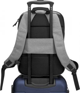 Un compartimento acojinado y forrado con espacio para guardar una notebook. Bolsillo horizontal en el frente con amplio espacio. Espaldar y correas acojinadas, con malla que permite la ventilación de la espalda. Cuenta con un bolsillo con cierre. Tira que permite enganchar la manija extensible de las valijas. El cierre del compartimento principal es invisible y cuenta con tirantes plásticos.
