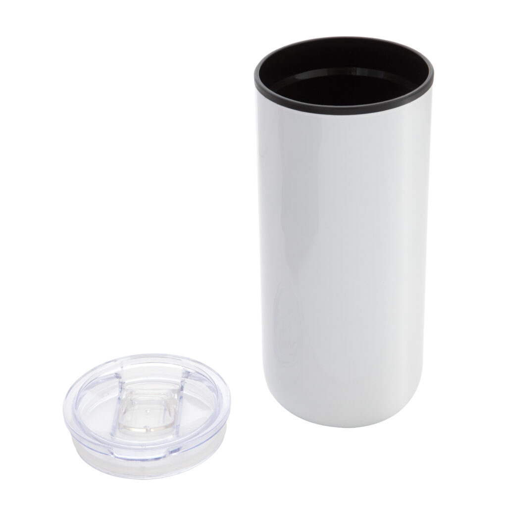 Mug doble pared. Interior en plástico y exterior de acero inoxidable 201. Tapa plástica transparente a presión con anillo de silicona. Base antideslizante.