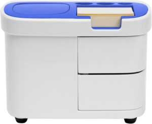 Cuenta en la parte superior con espacio para tres bolígrafos, notas autoadhesivas y un botón pulsador que sirve para guardar clips. Clips de colores incluidos. En la parte inferior dos cajones.