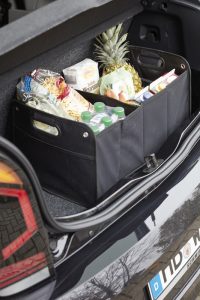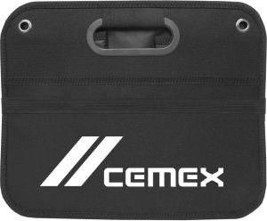 Fabricado en Polyester 600D. Organizador. Dos amplios compartimentos de 25,5 cm (aprox) cada uno con dos estructuras de cartón que permiten armar los contenedores. Uno de los compartimentos tiene un bolsillo de red. Manijas recubiertas en plástico. Arandelas metálicas. En la parte inferior contiene velcro que se adhiere a la superficie. Banda elástica que mantiene cerrado el organizador cuando no esta en uso.