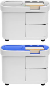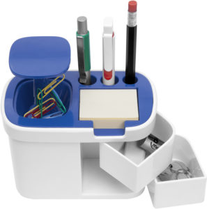 Cuenta en la parte superior con espacio para tres bolígrafos, notas autoadhesivas y un botón pulsador que sirve para guardar clips. Clips de colores incluidos. En la parte inferior dos cajones.