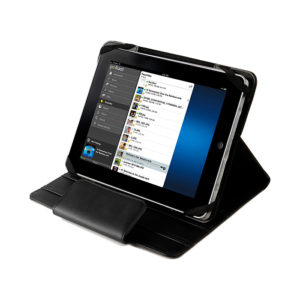 Porta tablet con bandas ajustables, cubierta de poliuretano, interior de terciopelo y poliuretano.