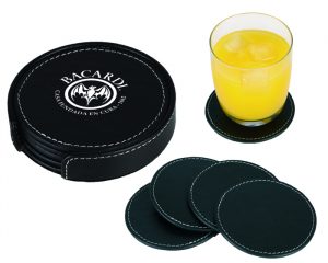Juego de 4 posavasos redondos de curpiel, detalle de costura en hilo blanco. Incluye base del mismo material.