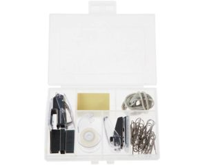 *Juego escolar en estuche color banco. Contiene: Engrapadora, Grapas, Perforadora, Notas, Cinta adhesiva, Clips, Ligas.