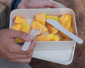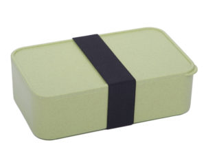 Recipiente para alimentos ecológico a base de fibra de trigo. Incluye tenedor y cuchillo con banda elástica para sujetar los cubiertos.