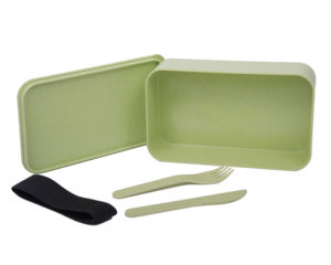 Recipiente para alimentos ecológico a base de fibra de trigo. Incluye tenedor y cuchillo con banda elástica para sujetar los cubiertos.