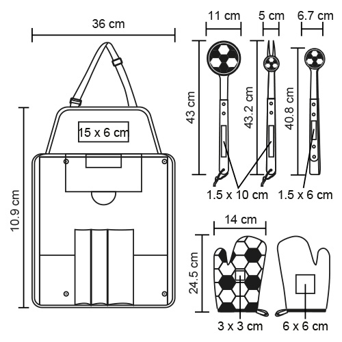 Set de BBQ en estuche con diseño de cancha de fútbol que también funciona como mandil. Incluye guante, pinzas, tenedor asador y volteador.