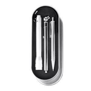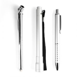Estuche metálico con calibrador de presión de llantas, lámpara de aluminio y pluma de tinta negra.