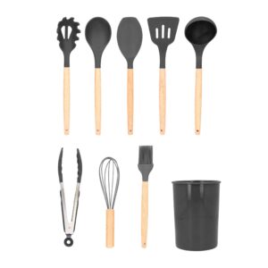 Set de cocina con 8 utensilios de silicona antiadherentes y madera. Incluye pinzas para cocina, volteador ranurado, servidor de pasta, batidor, cucharon de sopa profunda, cepillo para barnizar, cuchara solida y espátula.