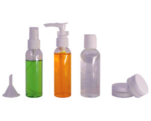 Set de contenedores para viaje incluye un contenedor despachador (80 ml), Contenedor con atomizador (60 ml), Contenedor (60 ml), Dos contenedores para crema (10 ml) y un embudo. Estuche transparente con cierre.