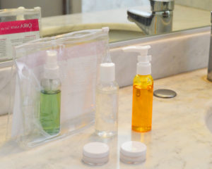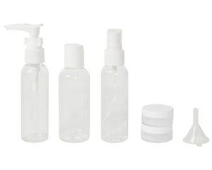 Set de contenedores para viaje incluye un contenedor despachador (80 ml), Contenedor con atomizador (60 ml), Contenedor (60 ml), Dos contenedores para crema (10 ml) y un embudo. Estuche transparente con cierre.