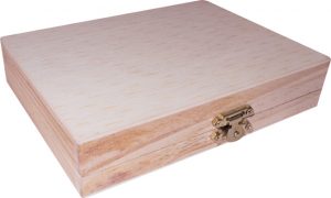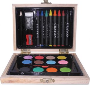 Set de dibujo en caja de madera. Con acuarelas, crayolas, pincel, lápiz negro, goma y sacapuntas.