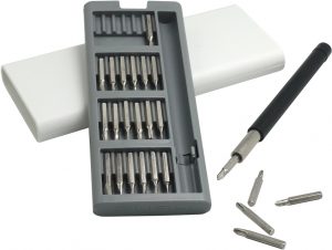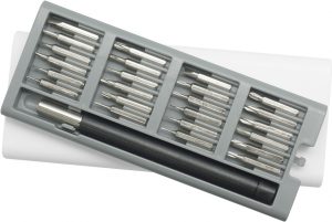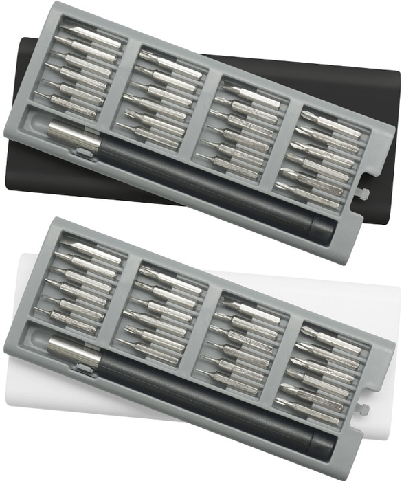 Mango con punta imantada con 24 puntas diferentes. La caja viene con cuatro compartimentos imantados que permiten mantener ordenadas las diferentes puntas.