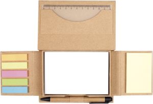 Incluye: block de hojas blancas, regla plástica transparente, 5 señaladores de colores, post-it, bolígrafo de cartón con punta, clip y pulsador de plástico negro.