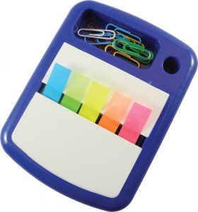 Incluye block de hojas blancas. Dispensador de banderitas de 5 colores diferentes. Compartimento para clips (incluidos). Porta lápiz.