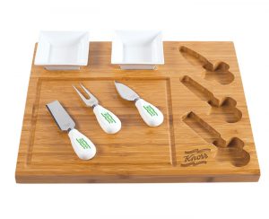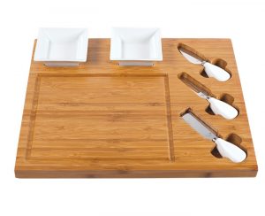 Tabla de quesos de bambú cuadrada. Incluye: 6 piezas: 2 tazones para salsas y especias. Utensilios con mango de cerámica: Cuchillo, espátula y tenedor de acero inoxidable.
