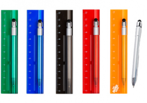 Set regla de 12 cm en plástico y bolígrafo con puntero para pantallas táctiles.