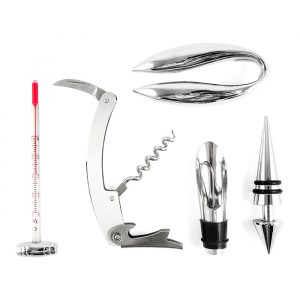 Set para vino en caja de madera rectangular, con 5 piezas; saca corchos (con navaja y destapador), vertedor de vino, tapón corta gota, corta cápsula de vino y termómetro.