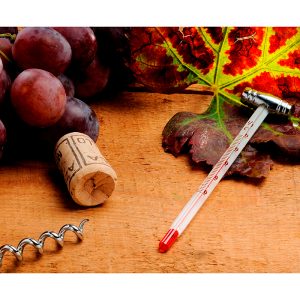 Set para vino en caja de madera rectangular, con 5 piezas; saca corchos (con navaja y destapador), vertedor de vino, tapón corta gota, corta cápsula de vino y termómetro.