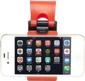 Soporte de celular para volante de automóvil, elástico de goma con traba que permite sujetarse al volante con soporte extensible para celular.