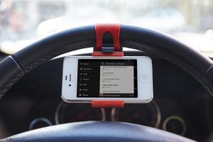 Soporte de celular para volante de automóvil, elástico de goma con traba que permite sujetarse al volante con soporte extensible para celular.