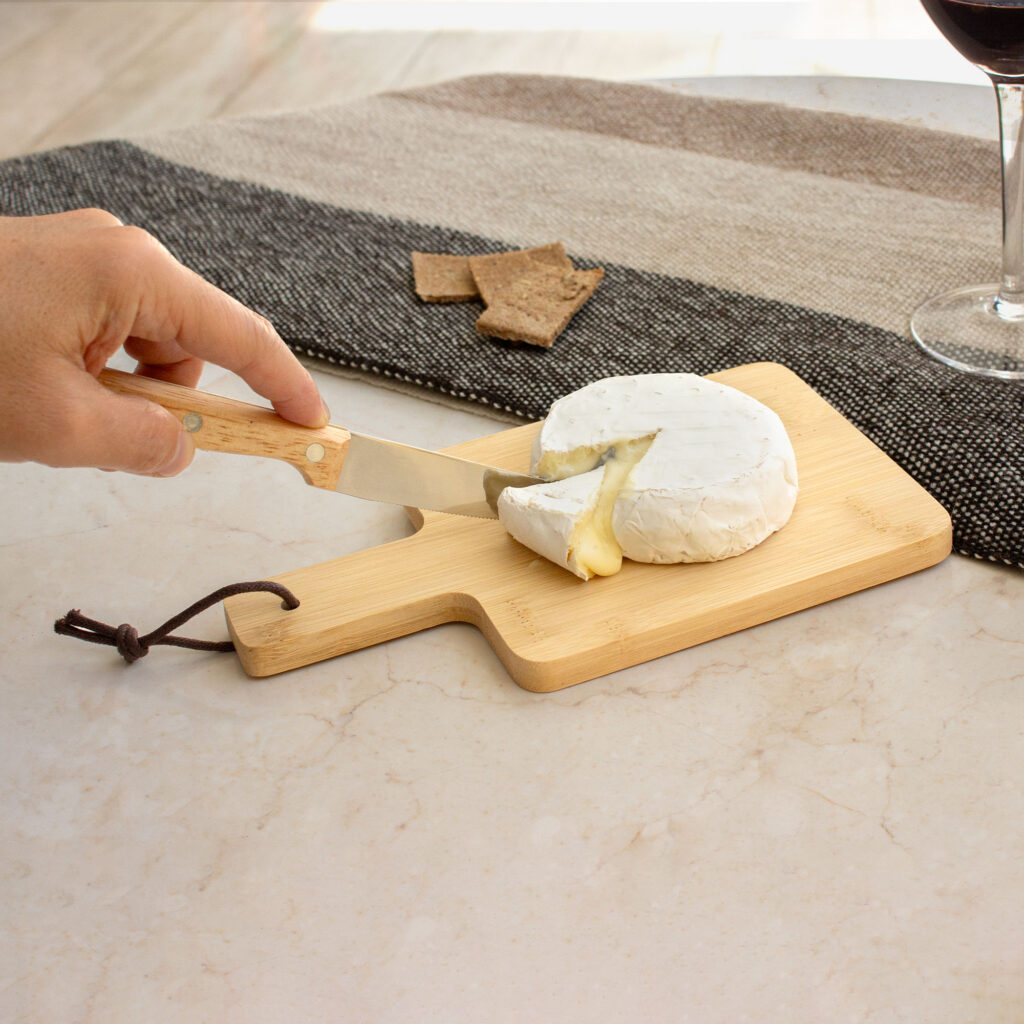 22 x 12 x 1,2 cm. Bambú + Acero inoxidable. Set de tabla de corte para quesos y cuchillo. Tabla con recubrimiento de aceite vegetal y correa en el mango. Cuchillo de 19,5 cm de largo, de acero inoxidable 420 y mango de madera. Presentación en caja de regalo kraft.