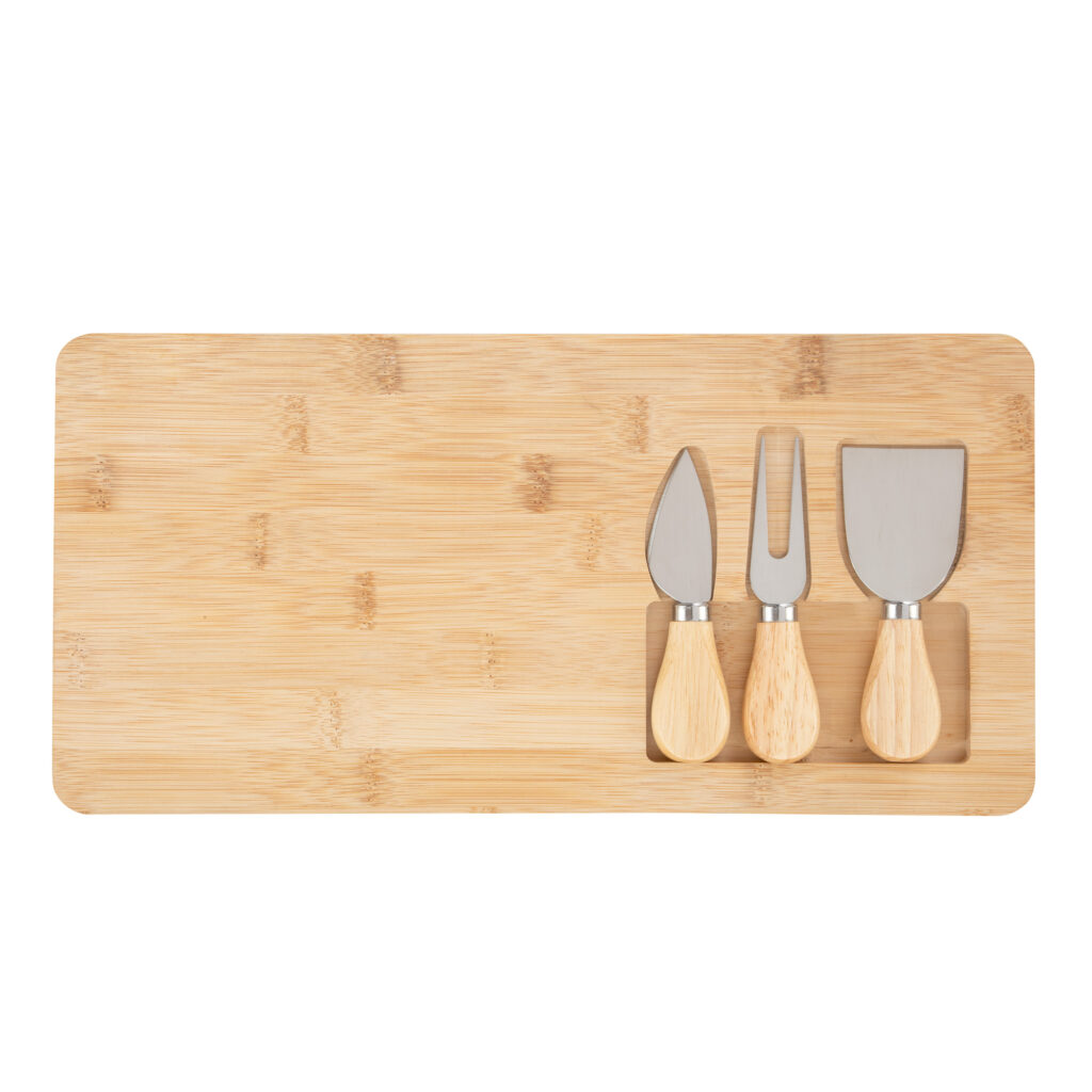 Tabla de bambú con set de 3 utensilios de acero inoxidable 420 con mango de madera de caucho: 1 cuchillo, 1 tenedor y 1 espátula.