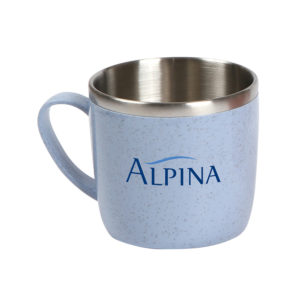 Taza fabricada en fibra de trigo (20%) y plástico PP (80%), con pared interna de acero inoxidable, fabricada con materiales de grado alimenticio, no utilizar en microondas, capacidad de 200 ml. Incluye caja de cartón individual.