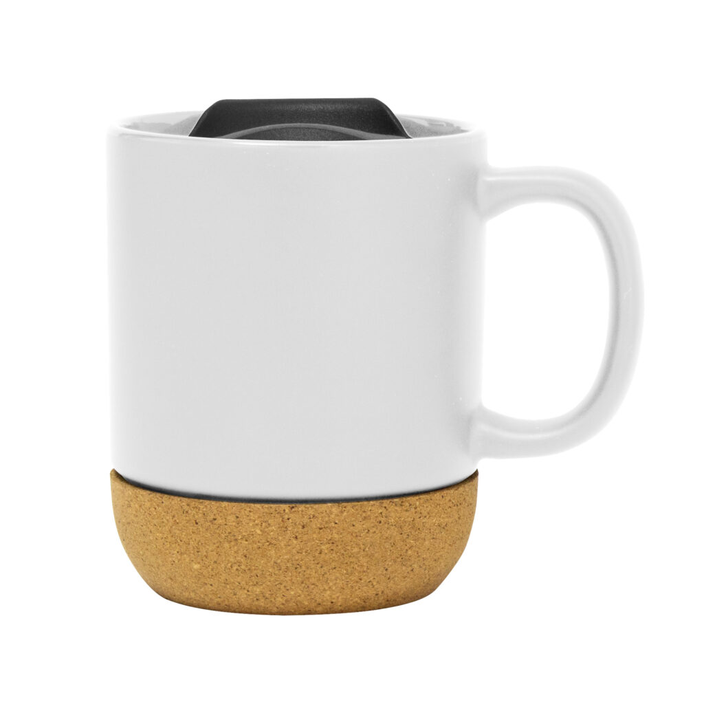 Taza sublimable con tapa. Tapa plástica a presión color negro con anillo de silicona. Base de corcho. Pintura con acabado mate. Producto apto para microondas siempre retirando la base de corcho.