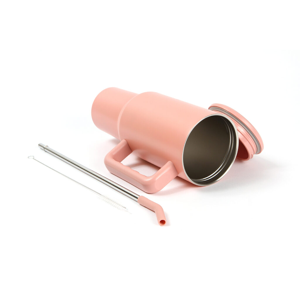 Termo fabricado en acero inoxidable de doble pared, tapa con entrada hermética para popote. Capacidad de 1,200 ml. Incluye agarradera y popote con boquilla de silicón.