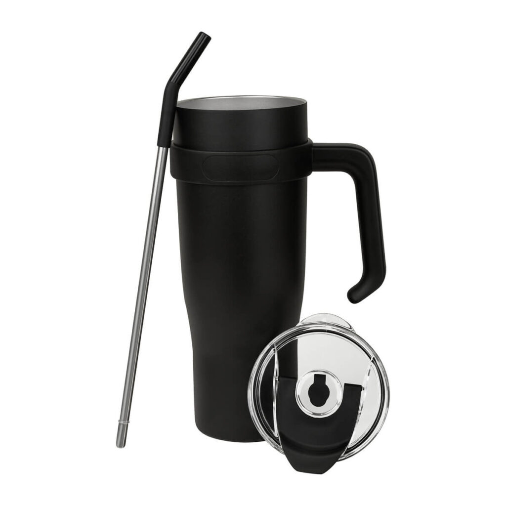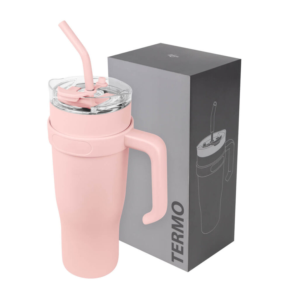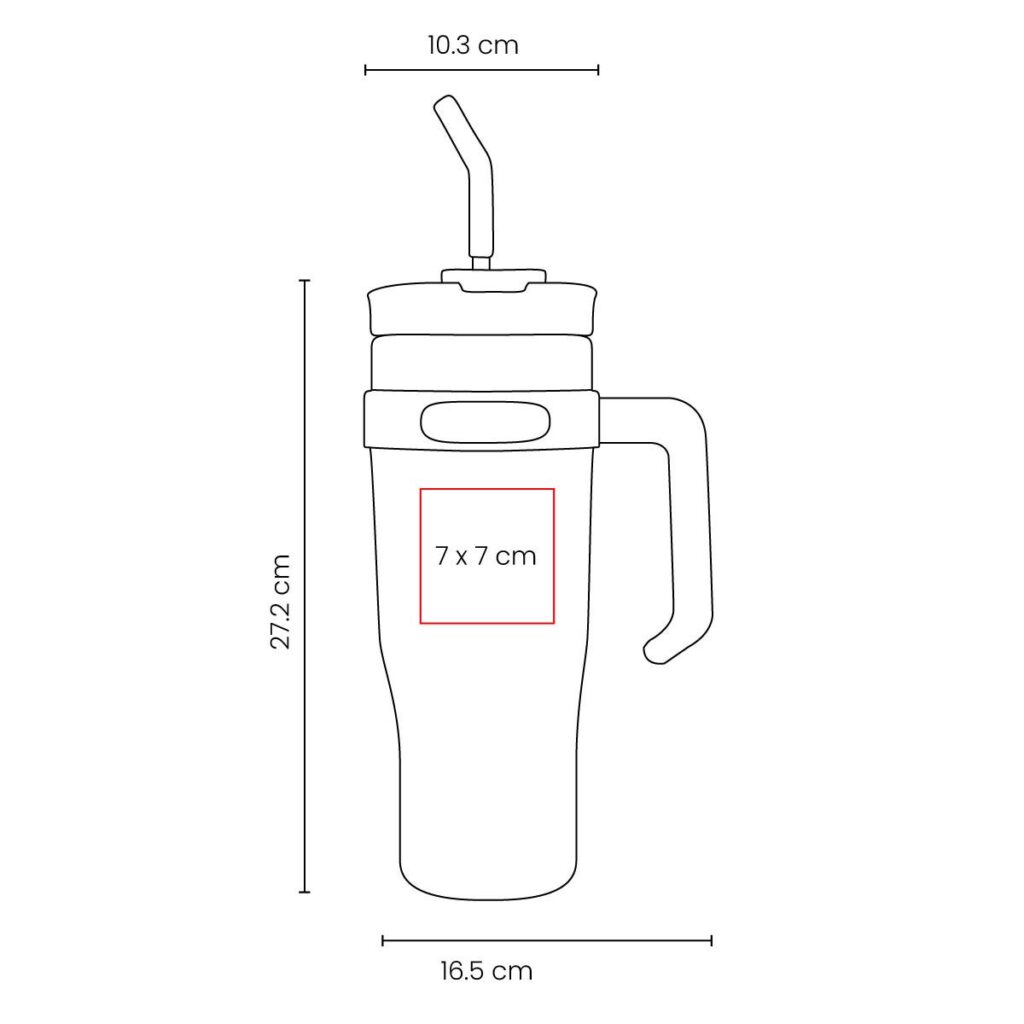 Termo doble pared. Cerrado al vacío. Pared interna y externa de acero inoxidable. Cuerpo con terminado rugoso. Tapa de plástico y sobretapa con sistema push, incluye una ranura para popote con tapón de silicón. Su cuerpo de amplia capacidad lo hace perfecto para compartir o disfrutar de varias tazas de tu bebida favorita, además su asa ergonómica permite un transporte fácil y cómodo. Mantiene la temperatura caliente por 12 hrs y la temperatura fría por 20 hrs. Capacidad de 40 Oz. Base de 8.2 cm de diámetro. Incluye popote metálico con boquilla de silicón y caja individual.