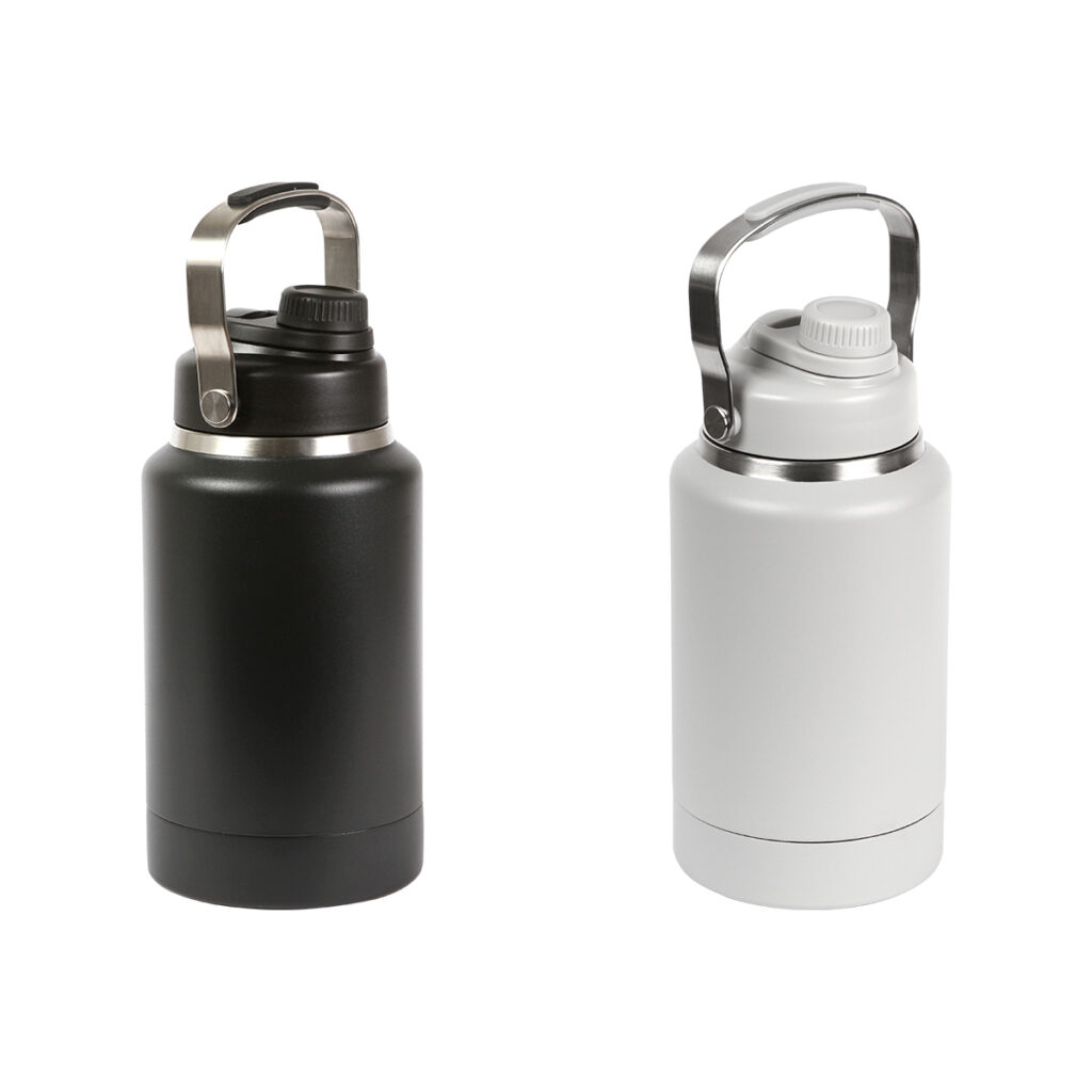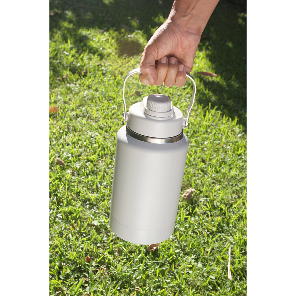 De doble pared fabricado en acero inoxidable 604, tapa de seguridad de rosca con boquilla. Capacidad de 1,800 ml. Incluye caja de color individual y asa metálica para transportar, peso 1,150 g.