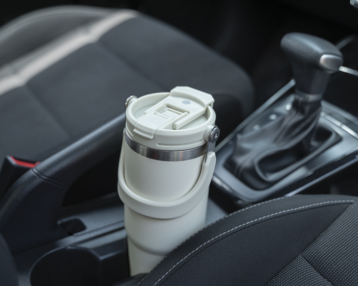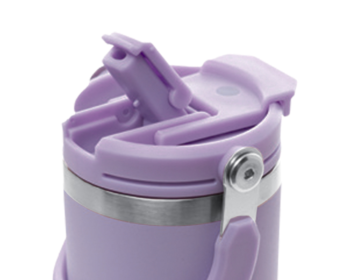 Termo de doble pared insulado al alto vacío, mantiene la temperatura caliente por 12 horas y fría por 24, cuenta con acabado de polvo plástico. La parte inferior es más angosta para poder ser usado en el porta vasos del coche. Tiene tapa de rosca con doble apertura: una con seguro elevable para ser usada con bebidas calientes y la otra con pivote desplegable y popote interno, para ser utilizada con bebidas frías. La tapa cuenta con agarradera giratoria y ergonómica. CAP.: 900 ml. Presentación: Caja de regalo a color.