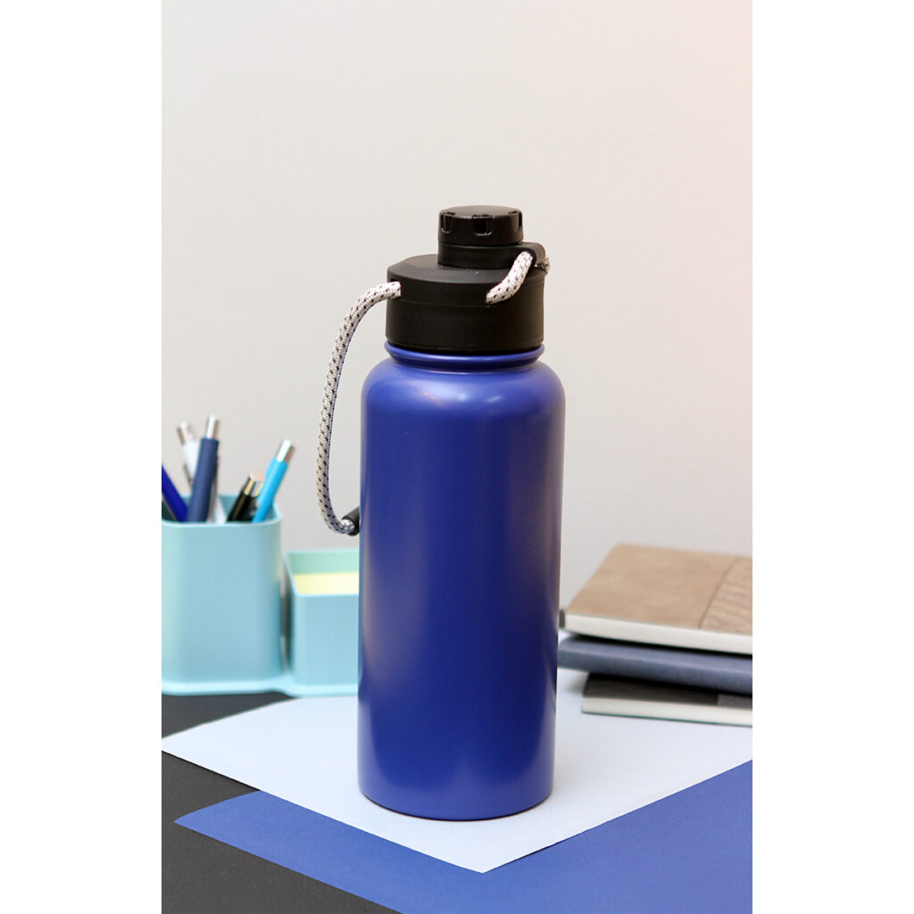 Termo fabricado en acero inoxidable 304 y 201. Incluye tapa de rosca fabricada en polipropileno con cordón adecuado para cargar y boquilla para tomar. Capacidad de 1 litro.