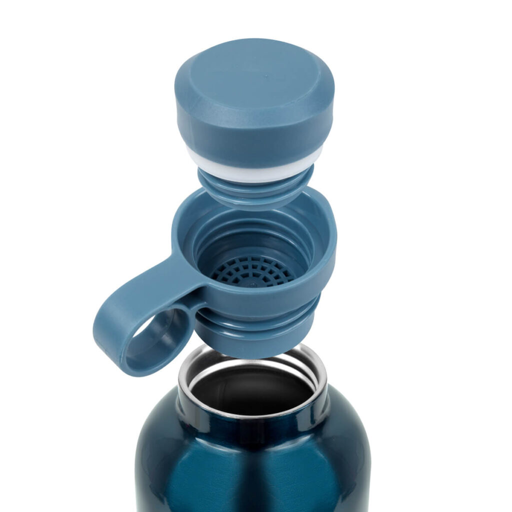 Termo de doble pared, cerrado al vacío. Pared interna y externa de acero inoxidable. Incluye tapa de plástico con doble sistema de rosca, además de incorporar un filtro para preparar té o infusiones. Su asa integrada facilitará que los lleves a todos lados, además su acabado brillante y colores metalizados le dan un toque sofisticado, ideal para la oficina, el gimnasio o cualquier aventura. Mantiene temperatura caliente 6 hrs y temperatura fría 12 hrs. Capacidad 22 Oz. Incluye individual.