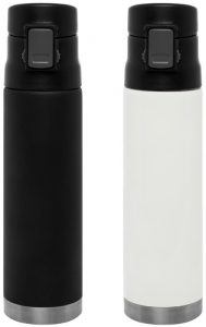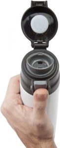 Fabricado en metal de doble pared. Tapa plástica con botón que permite la apertura. Traba de seguridad.
