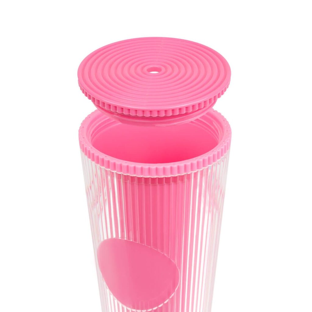 Vaso de doble pared. Pared interna y externa de plástico. Tapa de rosca y ranura para popote. Diseñado moderno de acabado texturizado, con líneas en relieve le dan un toque único y moderno. Ideal para oficina, escuela o para disfrutar de tus bebidas mientras viajas. Capacidad de 24 Oz. Base de 7 cm de diámetro. Incluye popote de plástico y caja individual.