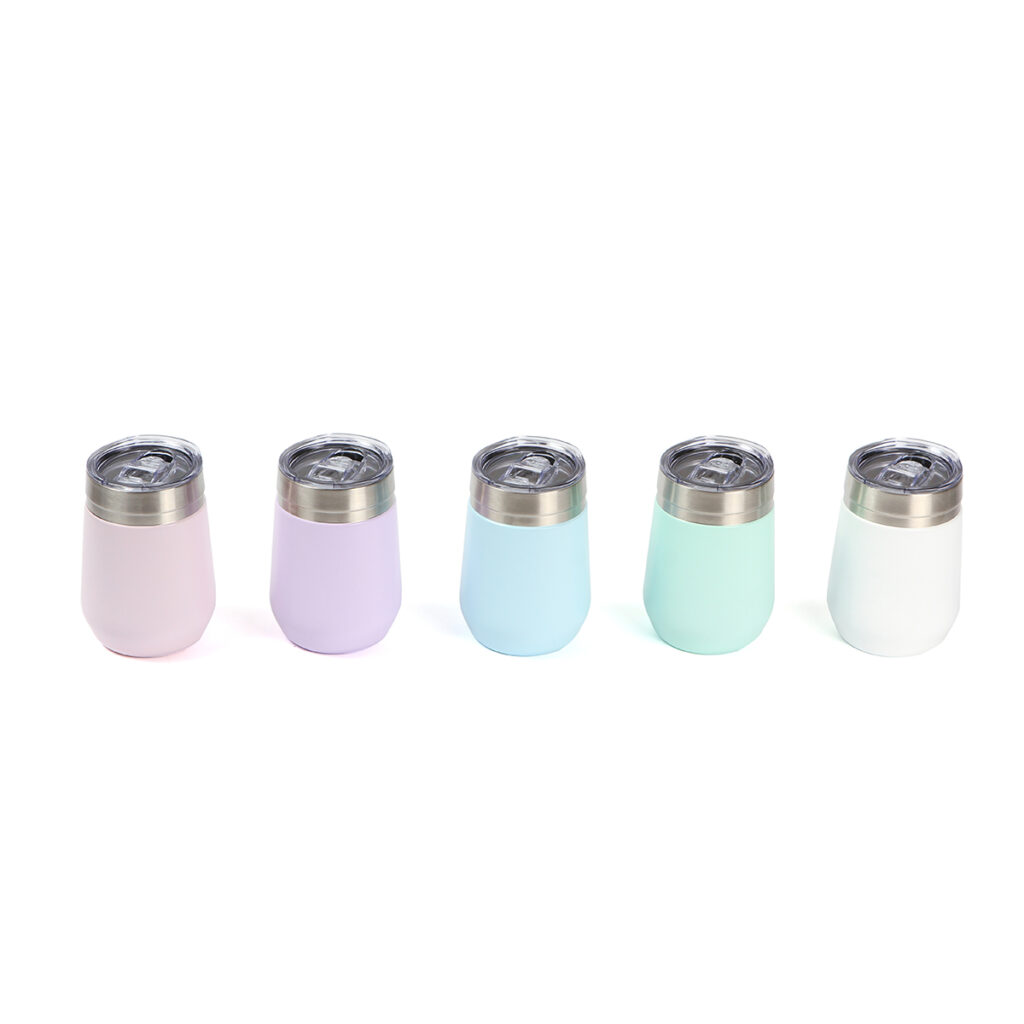 Vaso fabricado en acero inoxidable doble pared, con capacidad de 350 ml. Incluye tapa transparente con broche de cerrado. Diseño en color brillantes y detalles metálicos.