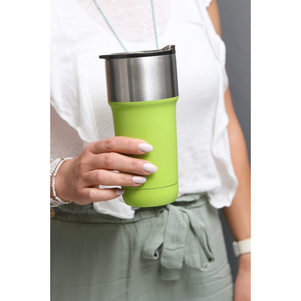 Vaso térmico doble pared, fabricado en acero inoxidable 304 y 201. Capacidad de 590 ml. Detalle cromado y cuerpo de color, tapa deslizable con pestaña abre fácil.